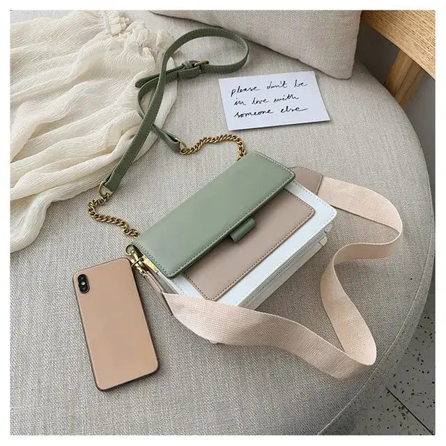 Stylish leather crossbody bag with green and beige color-block design, ideal for shopping and everyday use, on a modern floor background.