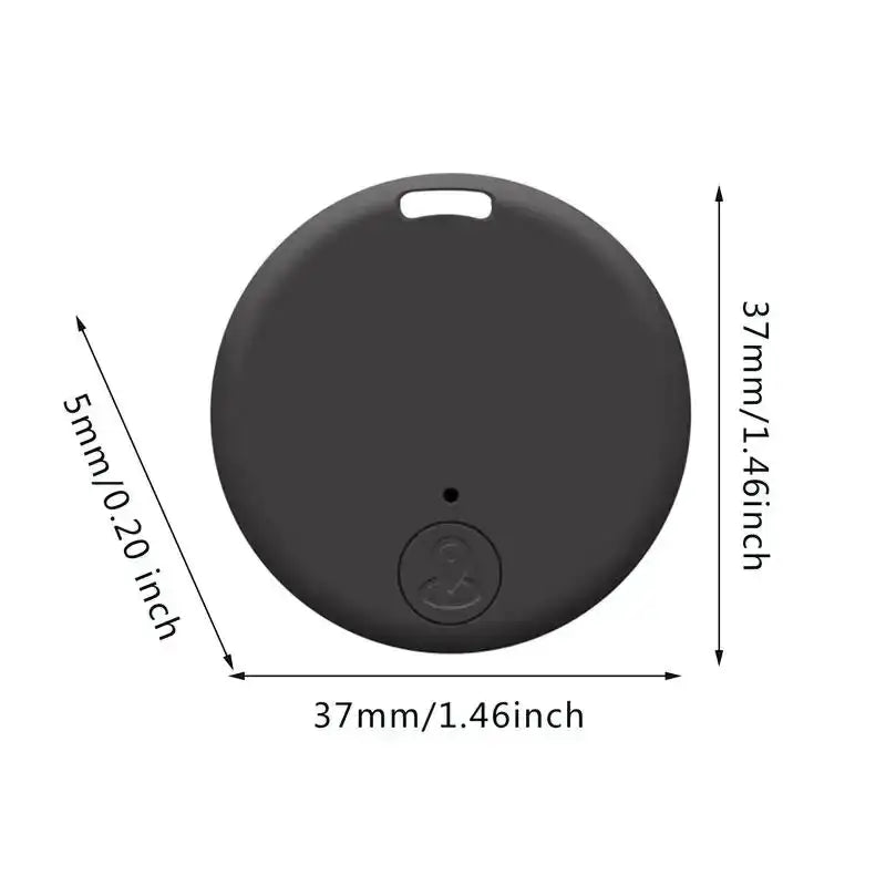 Dimensions of eThings Smart GPS Anti-Loss Alarm: 37mm diameter, 5mm thickness, black tracker for keys and handbags.