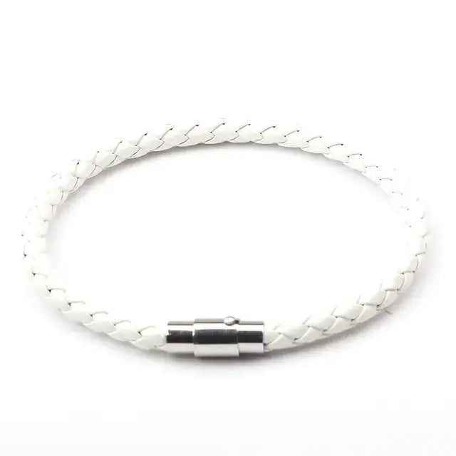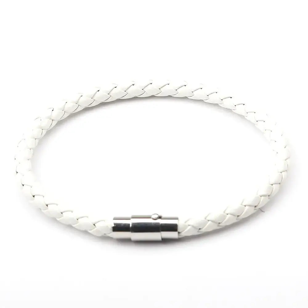 White braided bracelet with magnetic buckle closure, offering sleek design and easy wear.