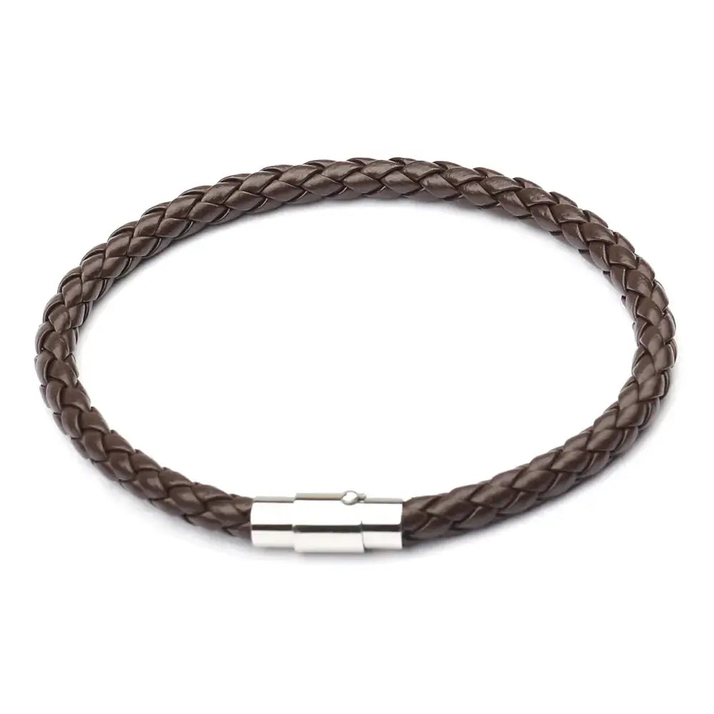 Brown braided magnetic buckle bracelet with silver closure, showcasing modern and sleek design