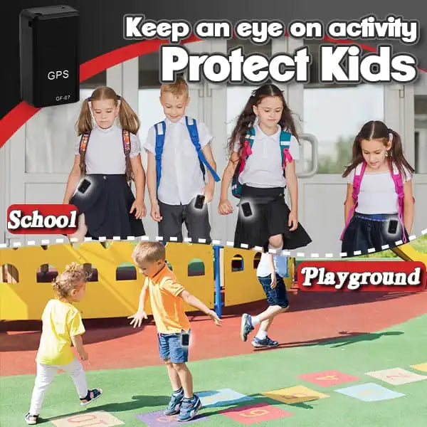Children using GPS trackers for safety at school and playground.