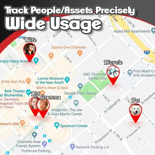 Map showing tracking locations for kid, grandma, wife, pet, and bicycle with GPS tracker for precise monitoring and wide usage.