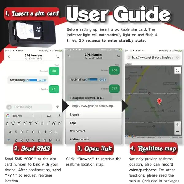 • Load image into Gallery viewer, Step-by-step guide to set up a GPS tracker, showing SIM card insertion, sending SMS, accessing GPS link, and real-time map usage.