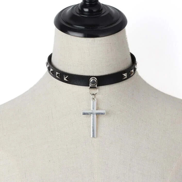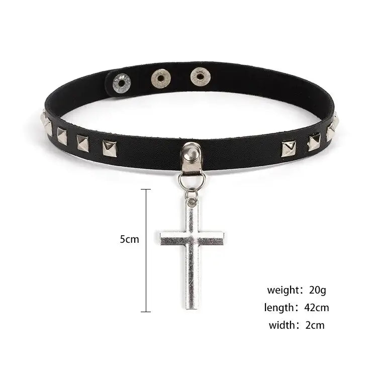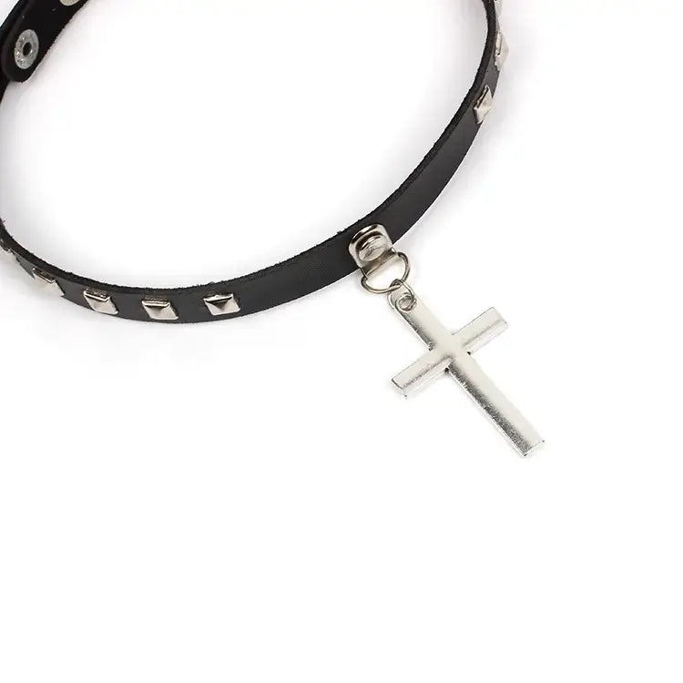Leather cross choker necklace with punk-inspired design and silver studs. Unisex, fashion-forward accessory for bold style statements.