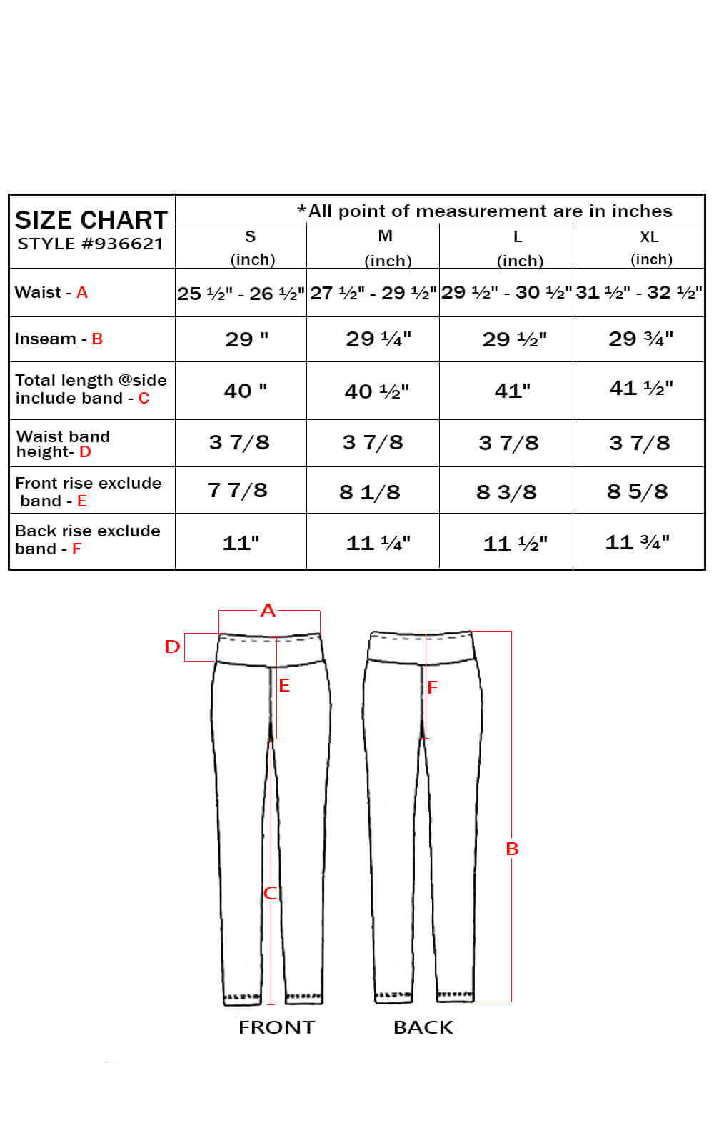 • Small (S) (Inch): Waist: 25½" - 26½", Inseam: 29", Total length (@ side including band): 40", Waist band height: 3 7/8", Front rise (exclude band): 7 7/8", Back rise (exclude band): 11". Medium (M) (Inch): Waist: 27½" - 29½", Inseam: 29¼", Total length (including band): 40½", Waist band height: 3 7/8", Front rise (excluding band): 8 1/8", Back rise (excluding band): 11¼".