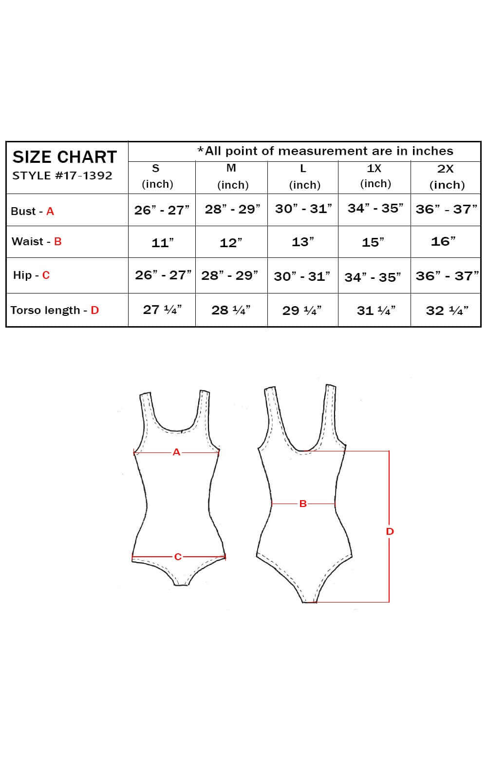 • X-Large Plus (XL) (Inch): Bust: 34"-35", Waist: 15", Hip: 34"-35", Torso Length: 31¼", XX-Large Plus (XXL) (Inch): Bust: 36"-37", Waist: 16", Hip: 36"-37", Torso Length: 32¼".