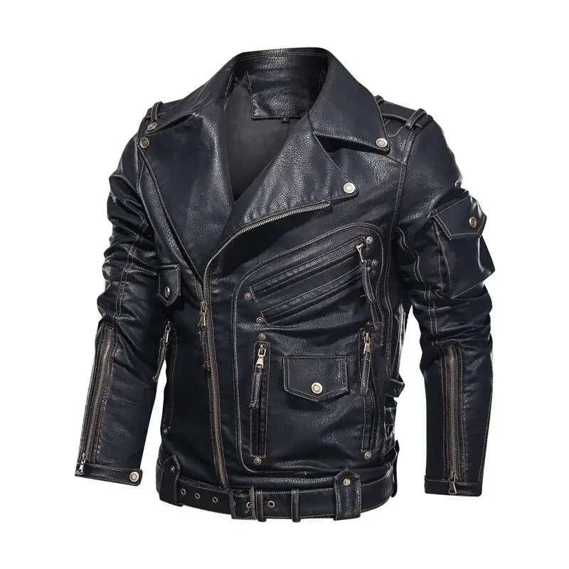 Men's vegan leather jacket with sleek design and multiple zippers, illustrating modern style and sophistication.