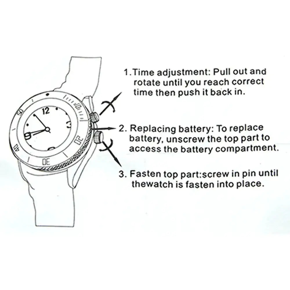 Illustration showing instructions for adjusting watch time, replacing battery, and fastening top part on a watch cigarette grinder.