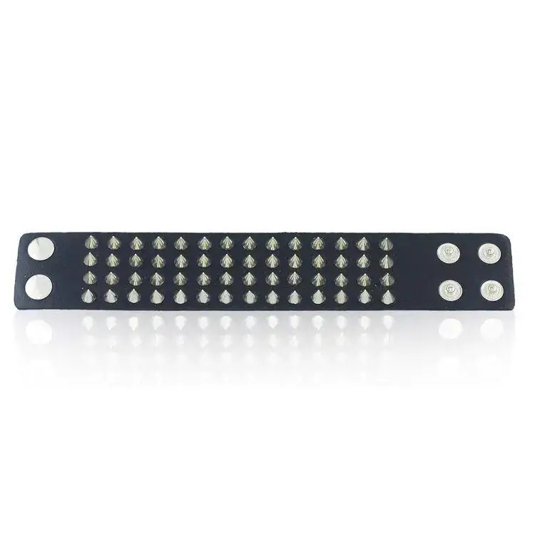 Embrace your unique style with our Faux Leather Bracelet with Spikes. The perfect blend of elegance and edge, this bracelet is designed for those who aren't afraid to express themselves. Its sleek faux leather and sharp spikes create a stunning contrast that adds a bold touch to any outfit. Wear it with pride and let your fashion sense shine through with every wear.