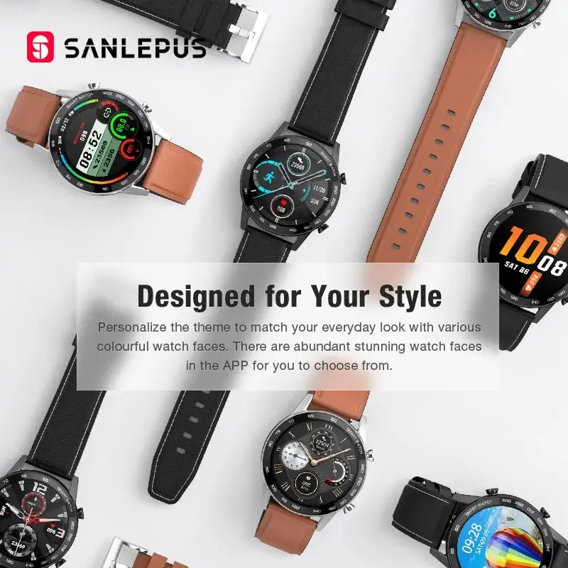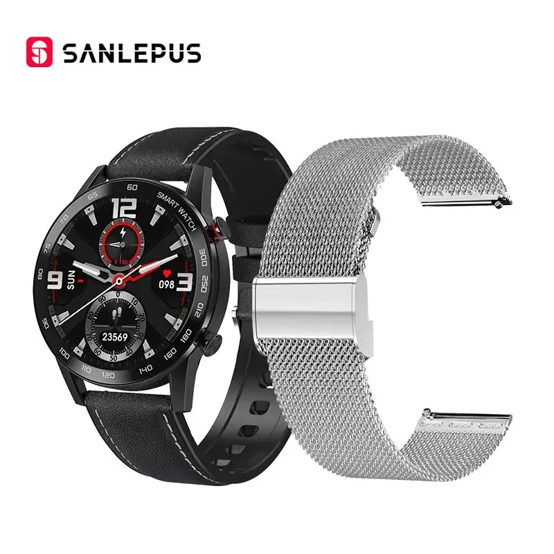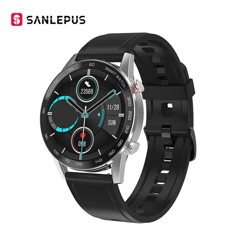 Business Smart Watch with black strap and digital display showcasing features, compatible with iOS and Android, by Sanlepus.