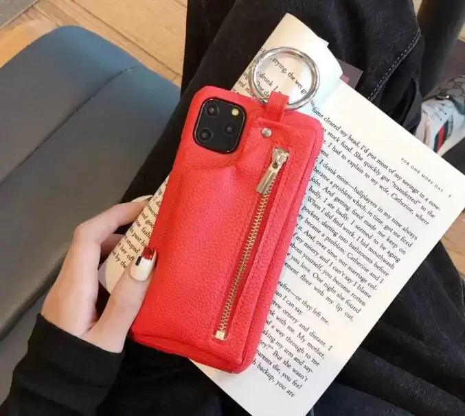 Elegant red luxury zipper PU leather wallet case on an iPhone held by a person.