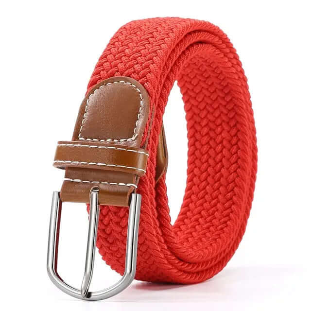 Red elastic leather belt with alloy buckle, vegan-friendly, offering comfort and style enhancement. Ideal for casual or formal outfits.