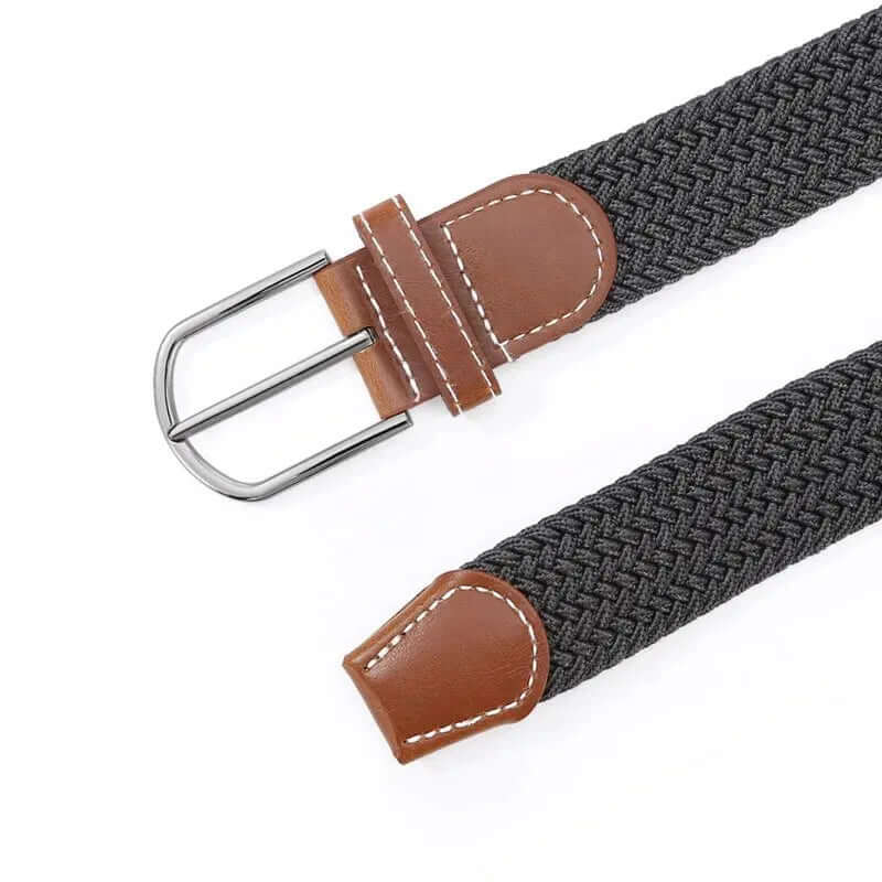 Elastic vegan leather belt with alloy buckle, grey textured design, and brown accent, offering comfort and style. Perfect for everyday use.