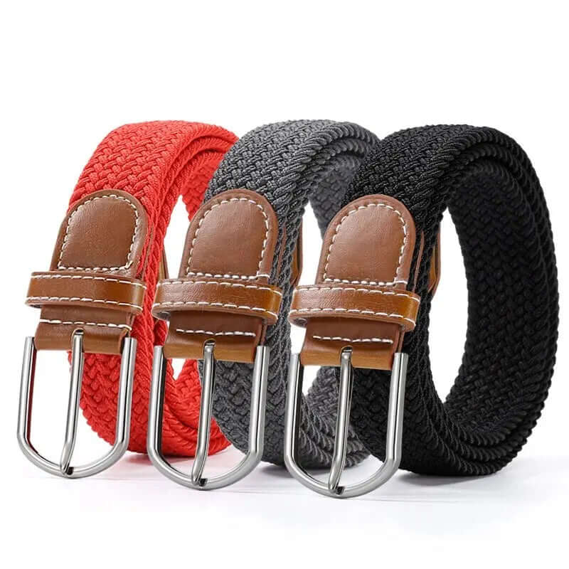 Three elastic leather belts with alloy buckles in red, grey, and black, offering style and comfort.