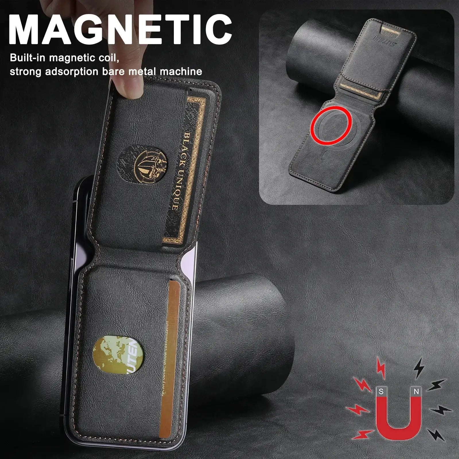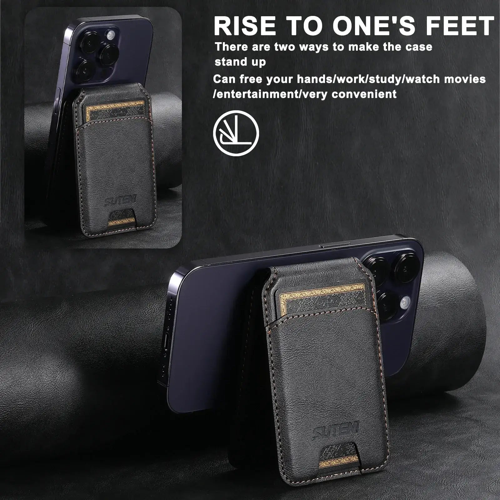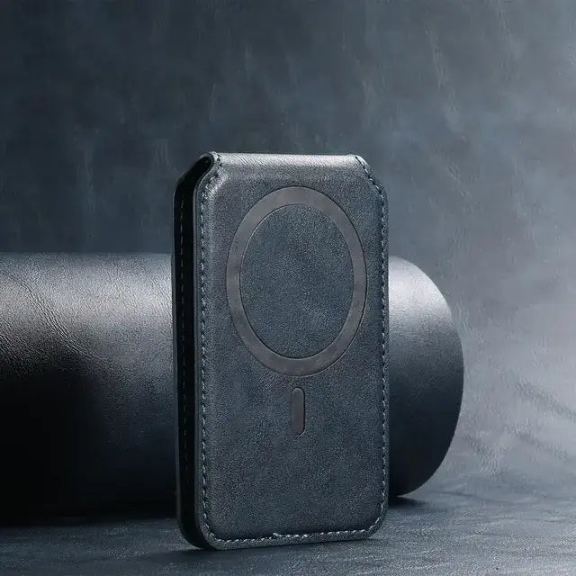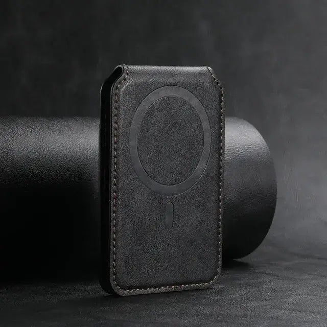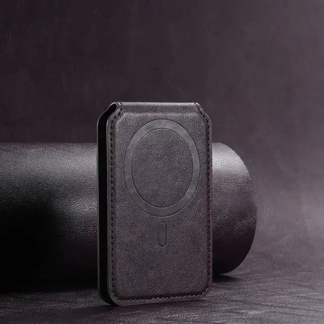 Luxury leather magnetic card holder for iPhone, showcasing sleek design and card slots for organizing essentials.