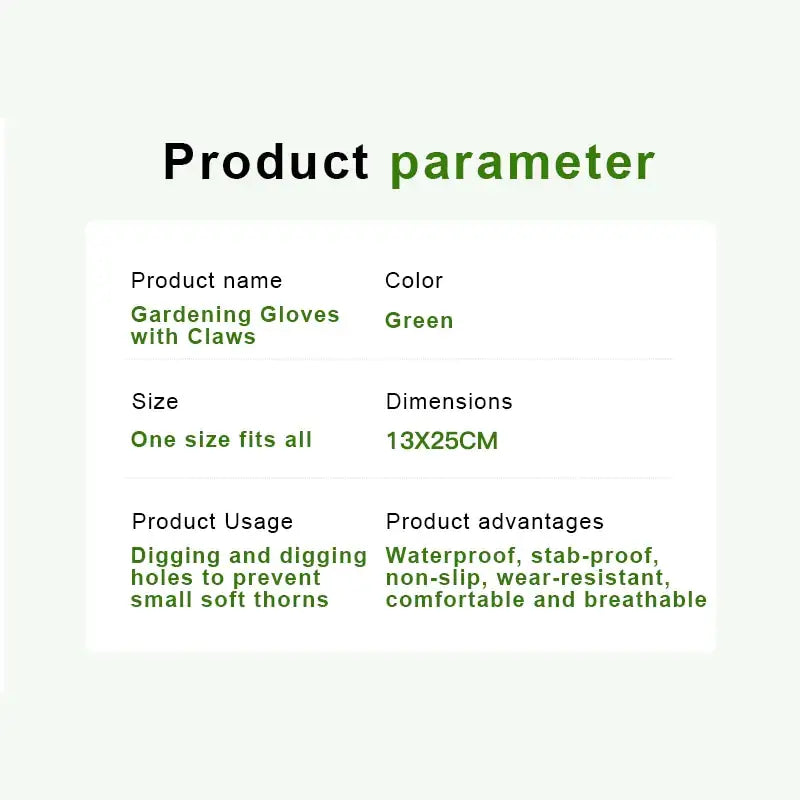 Elaborados con materiales duraderos y un diseño de garra de precisión, nuestros guantes de jardín con garra están diseñados para facilitar la excavación, la plantación y el deshierbe. Las garras integradas en cada guante le permiten cavar fácilmente en la tierra, romper la tierra compactada y combatir las malas hierbas rebeldes sin necesidad de herramientas adicionales, lo que le ahorra tiempo y esfuerzo en el jardín.