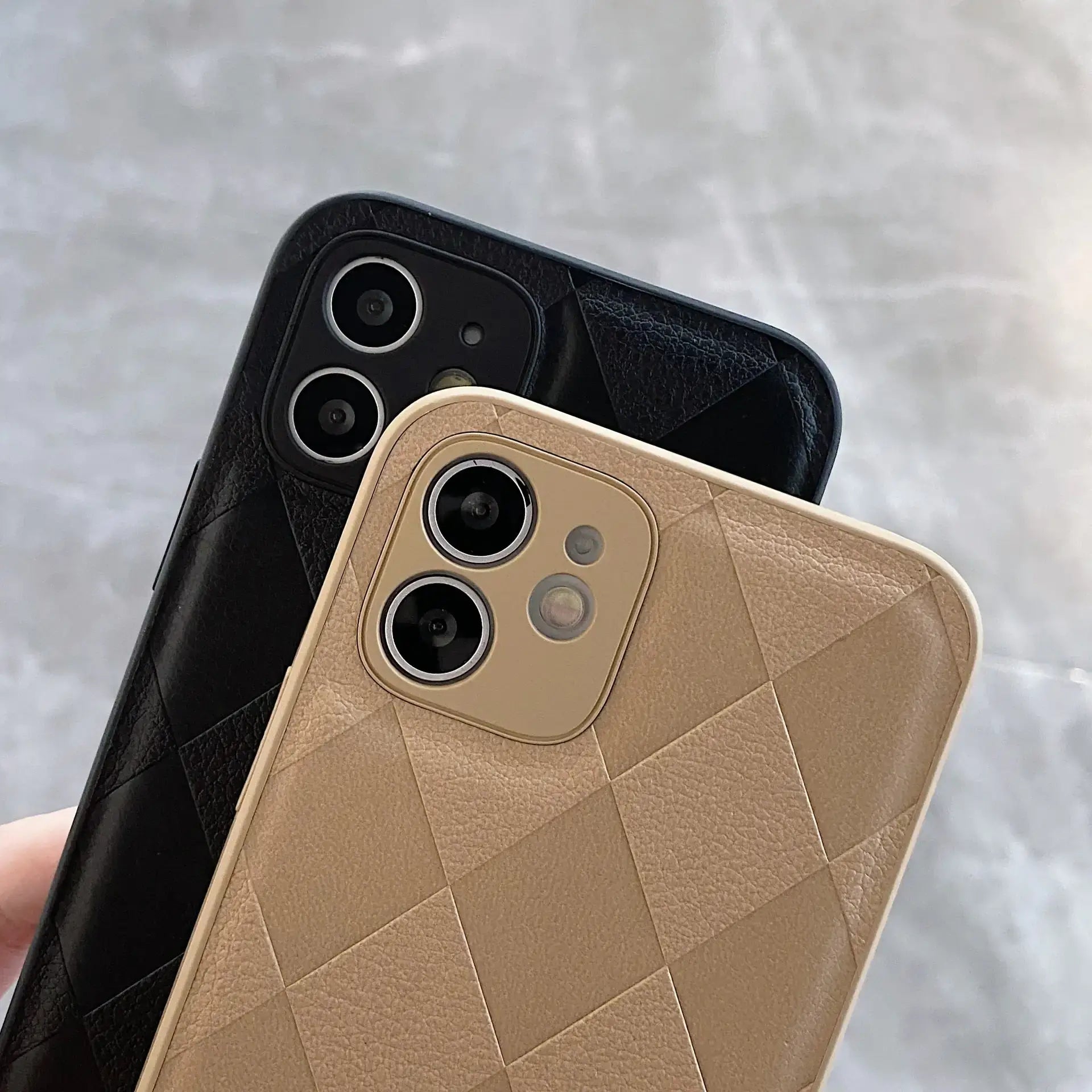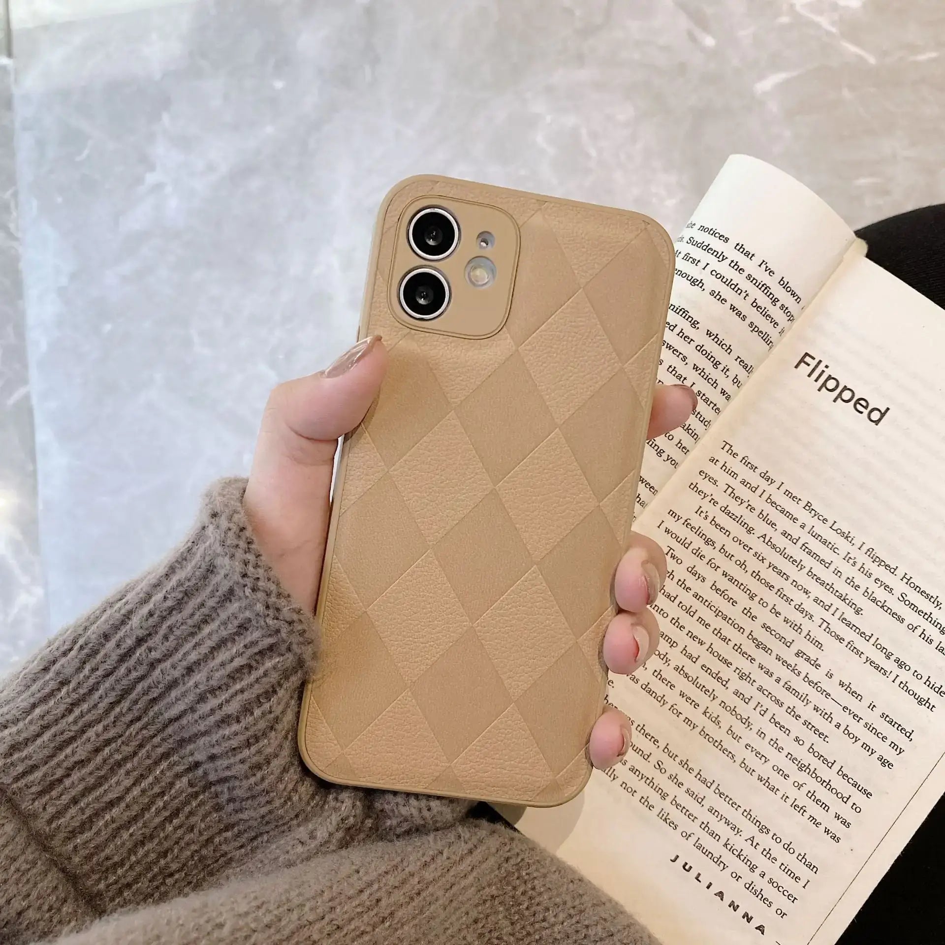 Person holding phone with Retro Leather Case in diamond pattern, soft PU vegan leather, stylish and protective.