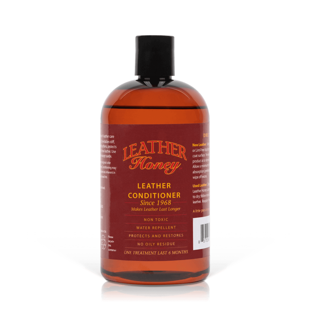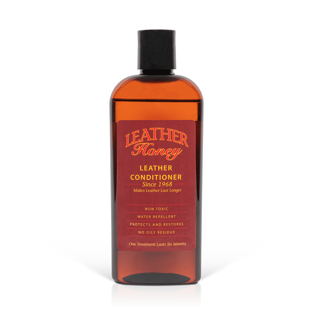 Various bottles of Leather Conditioner by Leather Honey, family-owned in the U.S. since 1968, for restoring and protecting leather items.