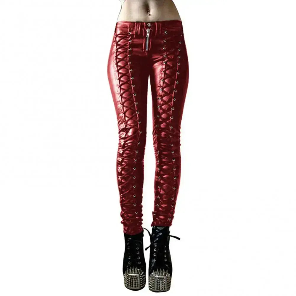 Red steampunk vegan leather skinny pants with front lace-up detail, showcasing an edgy and bold fashion statement.