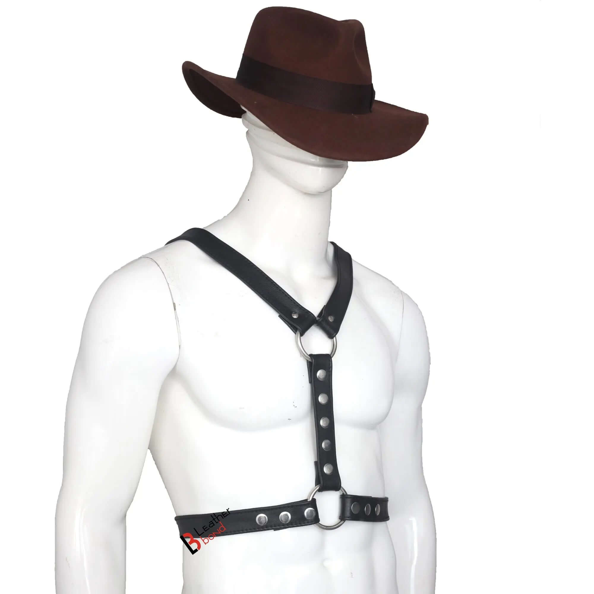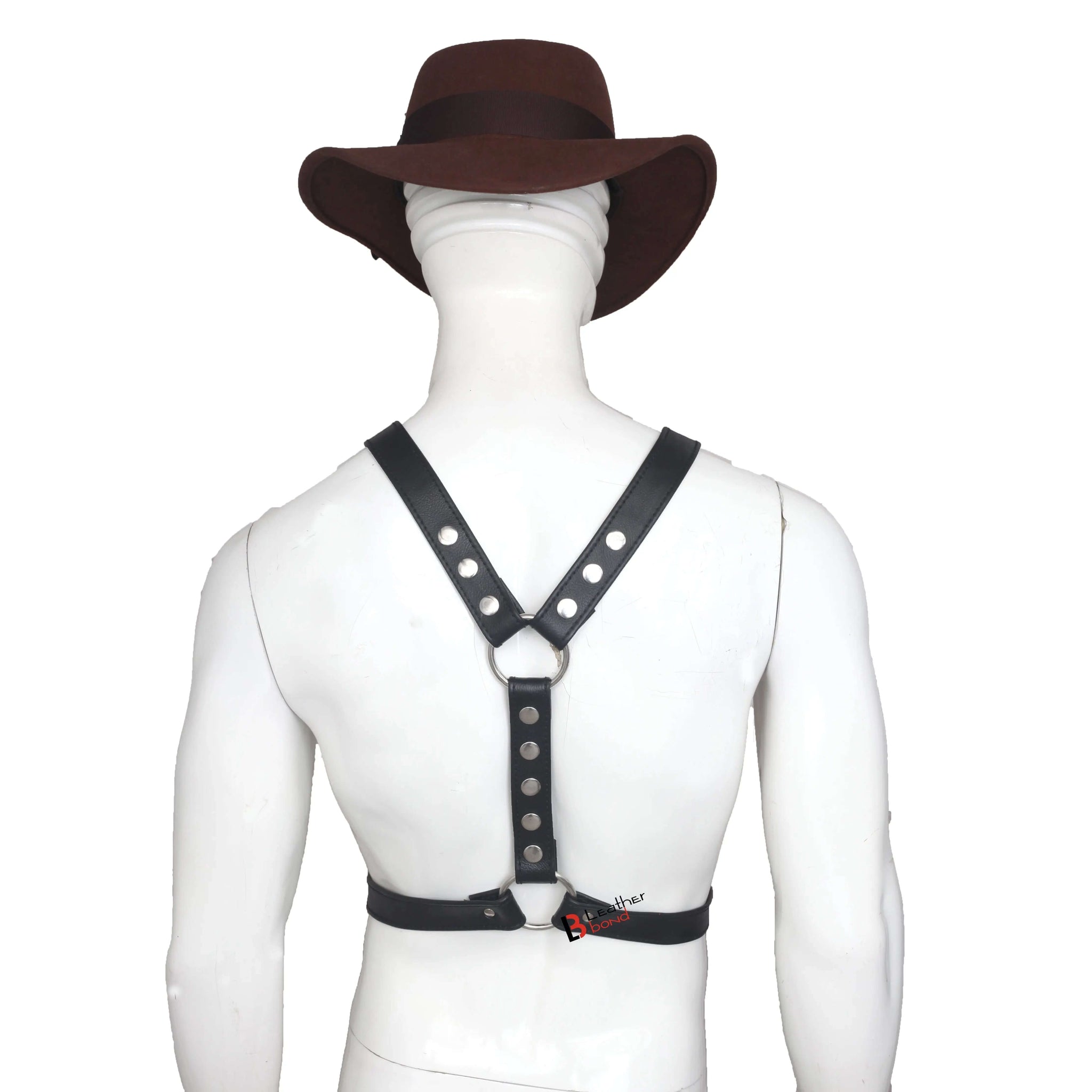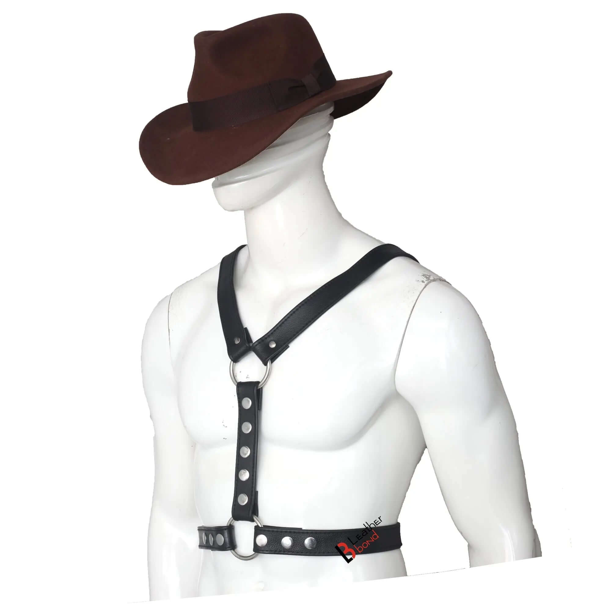 Double Folded Real Cowhide Leather Harness for Men Y shape Chest Harness Shoulder Harness Men Fetish Wear on mannequin with hat