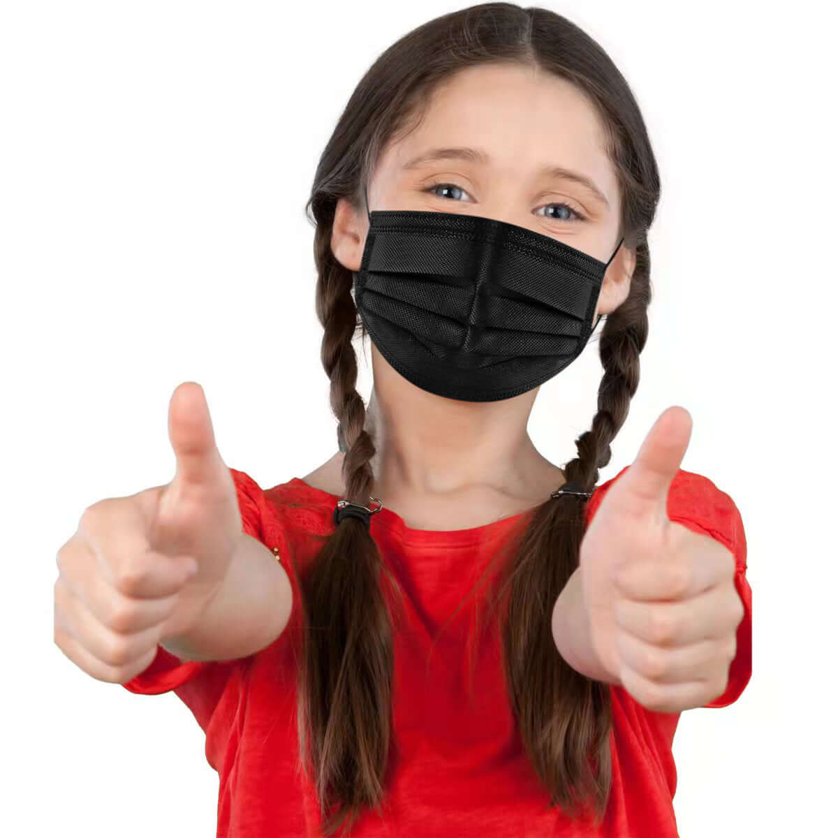 A child wearing a black disposable 3-ply filter face mask, giving a thumbs up.