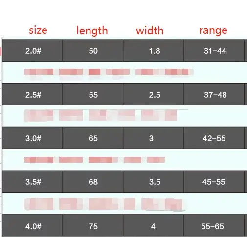 Leather dog collar size chart showing sizes 2.0# to 4.0#, with varying lengths, widths, and adjustment ranges for custom fit.
